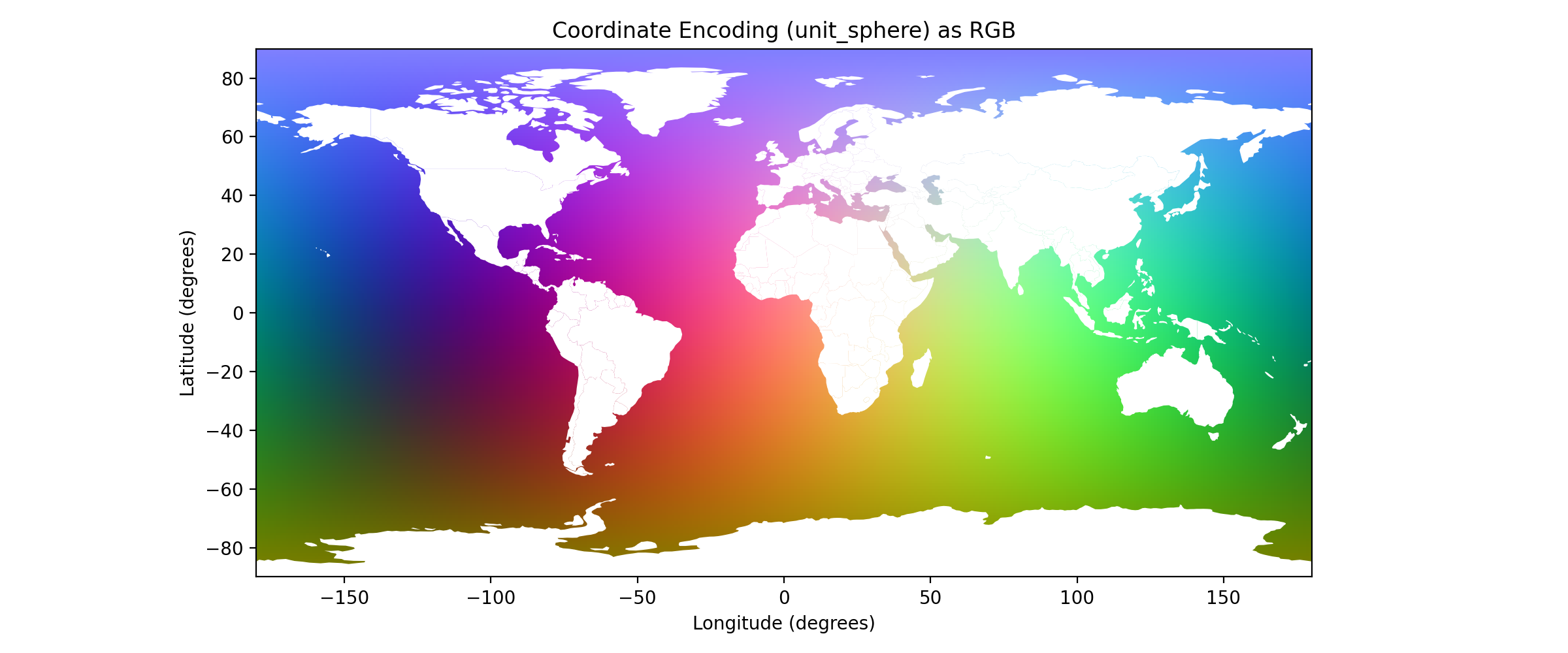 This image evaluates all integer (lat, lon) combinations and maps the 3D unit-sphere encoding (x, y, z) to RGB. It visualizes how each coordinate is transformed into a 3-value vector before FiLM embedding, showing smooth transitions and proper wrap-around from -90 to +90 and -180 to +180.