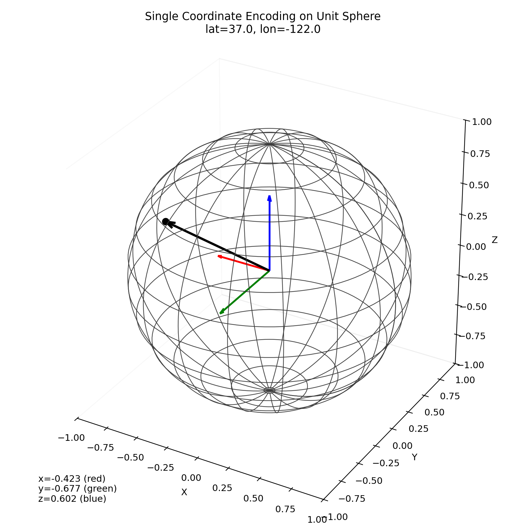 This 3D view shows one example coordinate encoded as (x, y, z) on the sphere. Red/green/blue arrows are the x/y/z components, and the black arrow is the resulting encoded vector.