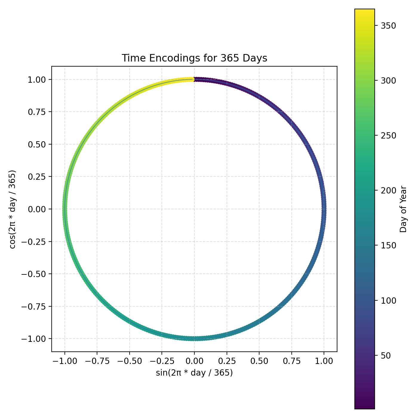 This plot shows all 365 day-of-year embeddings as points in the sin/cos plane. Each day maps to one point on the unit circle, which makes the representation periodic and year-wrap safe.
